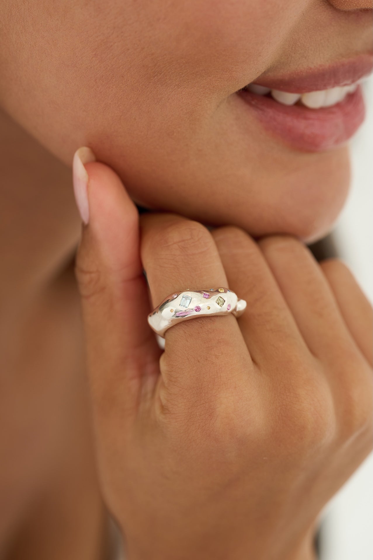 Spectacular sapphires, aquamarine and tourmaline deliciously set in our solid sterling silver chunky molten ring, creating a dazzling statement that will become the centrepiece of any outfit. The sophisticated molten silver of the chunky ring reflects light beautifully from its organic, fluid pattern, with a sprinkle of colourful gemstones in pink, white, yellow, green, and orange.