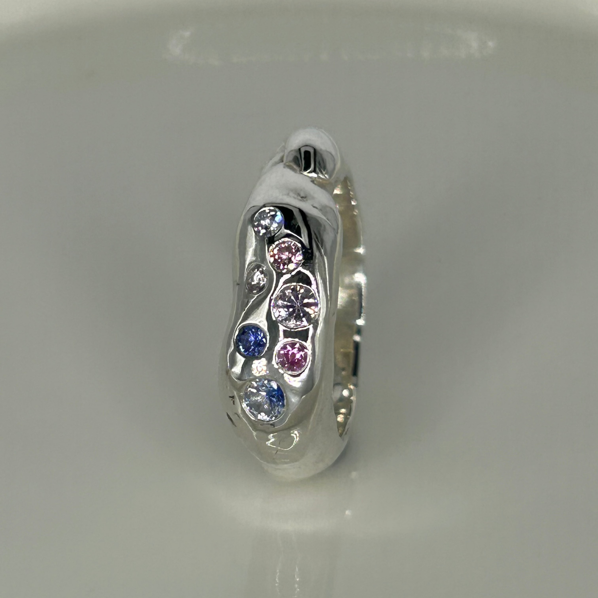This gorgeous Harlequin ring is a sparkling sprinkle of stunning sapphires set into solid sterling silver. For this stunning Sterling Silver and Sapphire Ring design, we took our popular Molten chunky sterling silver ring and added in a selection of stunning colours of sapphires, creating the most deliciously fun and eye catching ring.