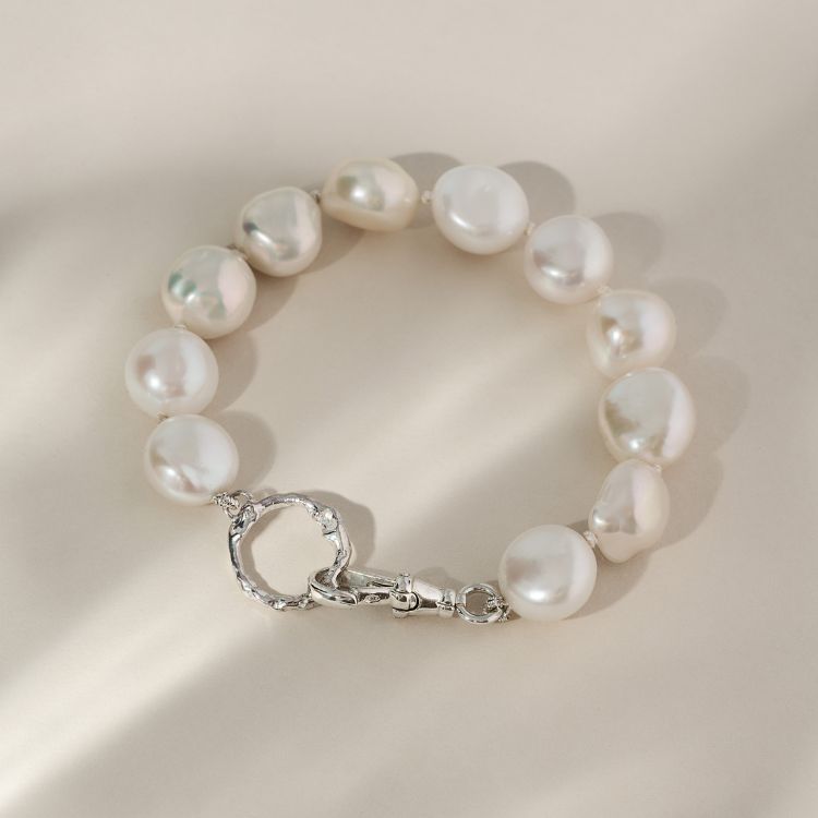 The bracelet is strung with beautifully irregular ivory pearls, each with a creamy lustre that complements all skin tones. Responsibly sourced, these pearls are cultured fresh water pearls and farmed for a reduced carbon footprint, making them a more sustainable choice. The molten halo, crafted from solid, 100% recycled silver, has been hand-finished to achieve a beautifully high shine, catching the light with every movement. Each bracelet is expertly strung by a master stringer, ensuring both durability and beauty.