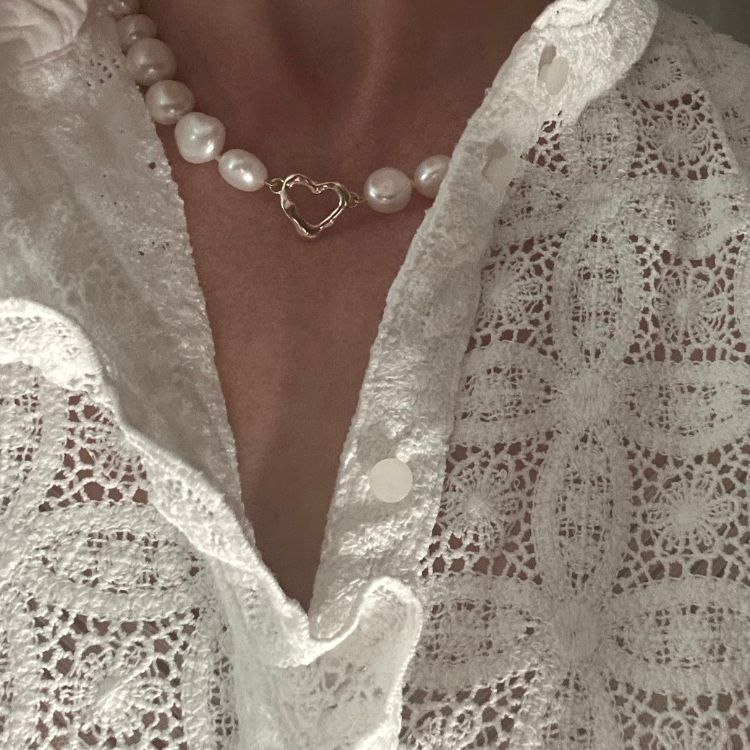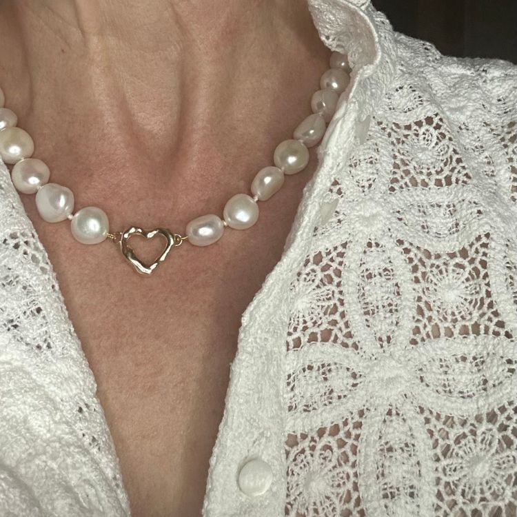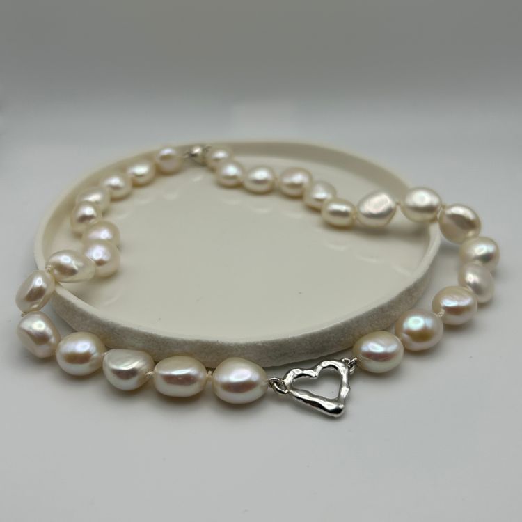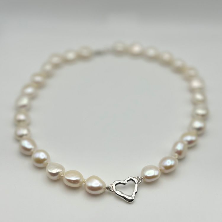 The pearl choker with silver molten heart measures approximately 16" or 18" long including both the string of pearls and the large silver molten heart, which has two options for placement: either centre or offset to the side - choose your preference using the buttons above. Shown in both silver and gold. The molten heart is made from solid, 100% recycled sterling silver.
