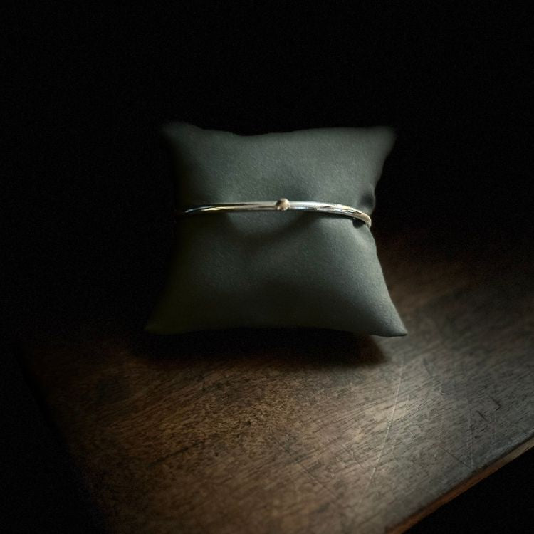 A really simple but beautifully effective design. A plain silver cuff bangle featuring a 9ct gold bobble. I wear one always as part of my stack of bangles. It is eye catching in its simplicity. Would suit small to medium wrist size as can be adjusted slightly.