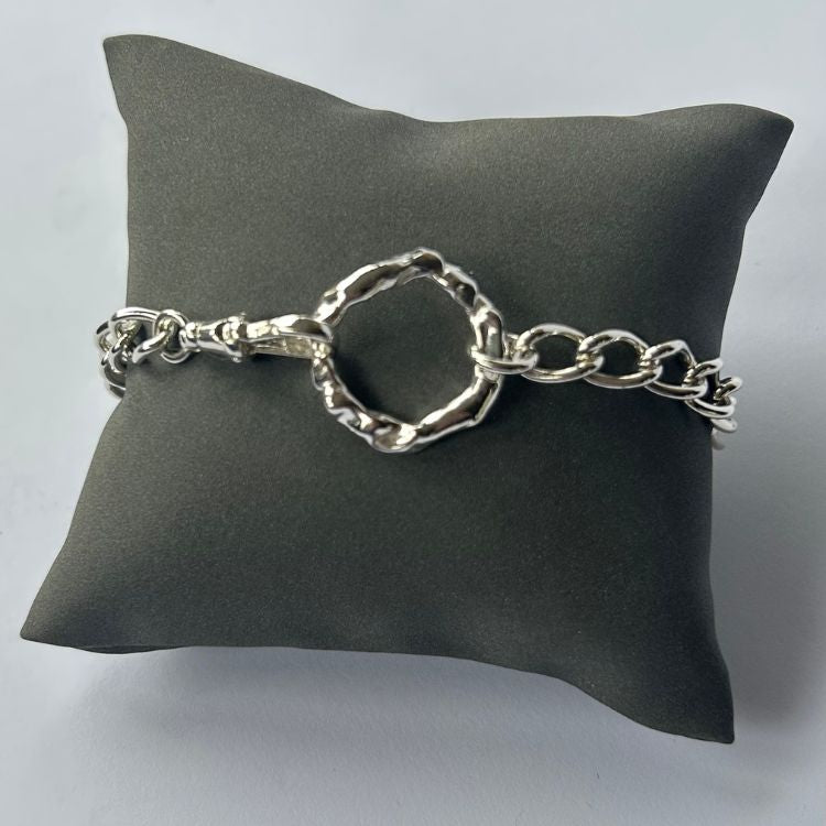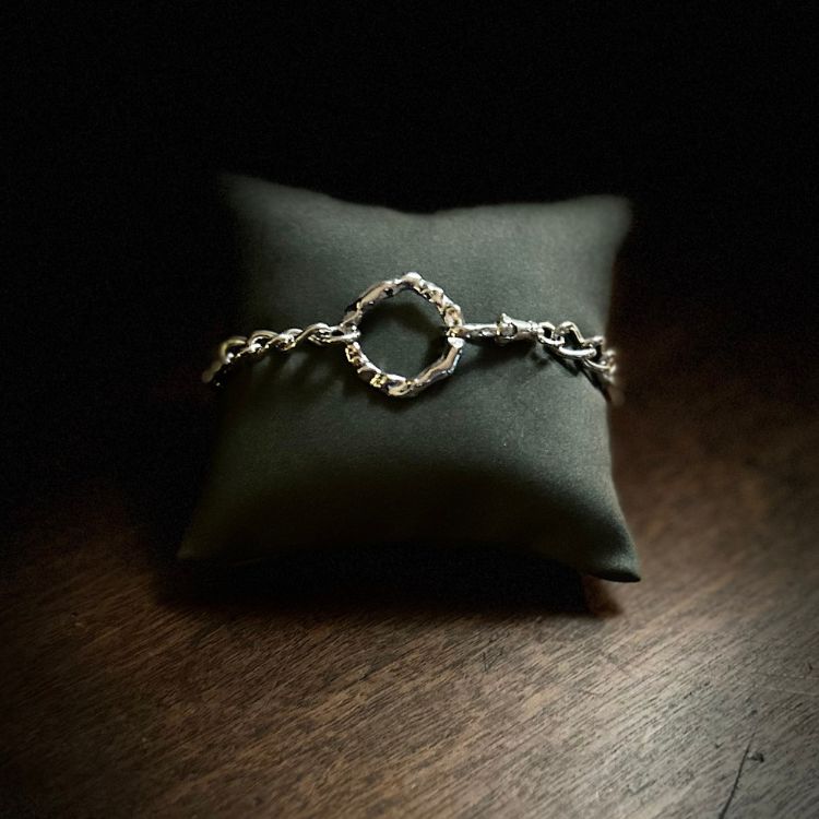 A beautiful vintage bracelet with a signature Lulu and Boo molten halo integrated into the bracelet and fastened with a silver Albert clasp. The fusion of the two has created a beautiful and wearable bracelet. Perfect alone or stacked with other bracelets and bangles it is a beautiful piece.