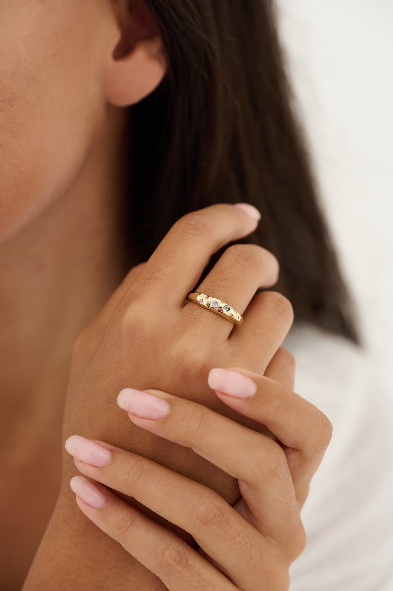 The sprinkling of square, round, princess and baguette cut gemstones are a rainbow of soft pastel hues from white through orange, pink and green, creating a design that can match to absolutely any outfit. The stones are set into shape of either our molten 9ct gold chunky ring or the slim version of the molten gold ring, both made from 100% recycled gold.